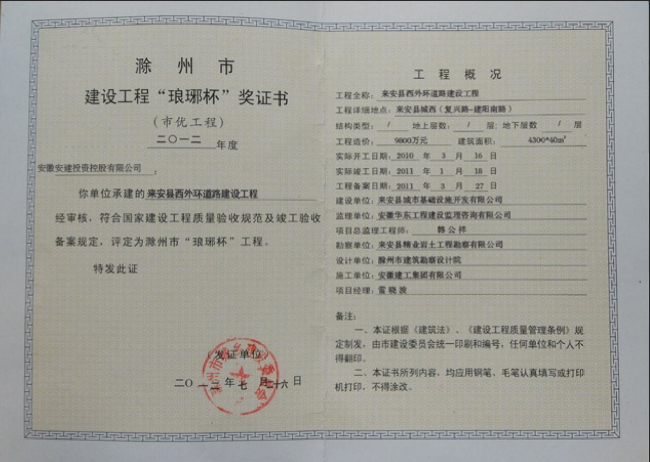 滁州市建設工程“瑯琊杯”獎